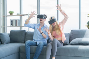 A western young couple wearing VR or virtual reality glasses, headsets sitting and playing a video game on sofa in front of TV at home in technology and innovation concept. Having fun. Entertainment